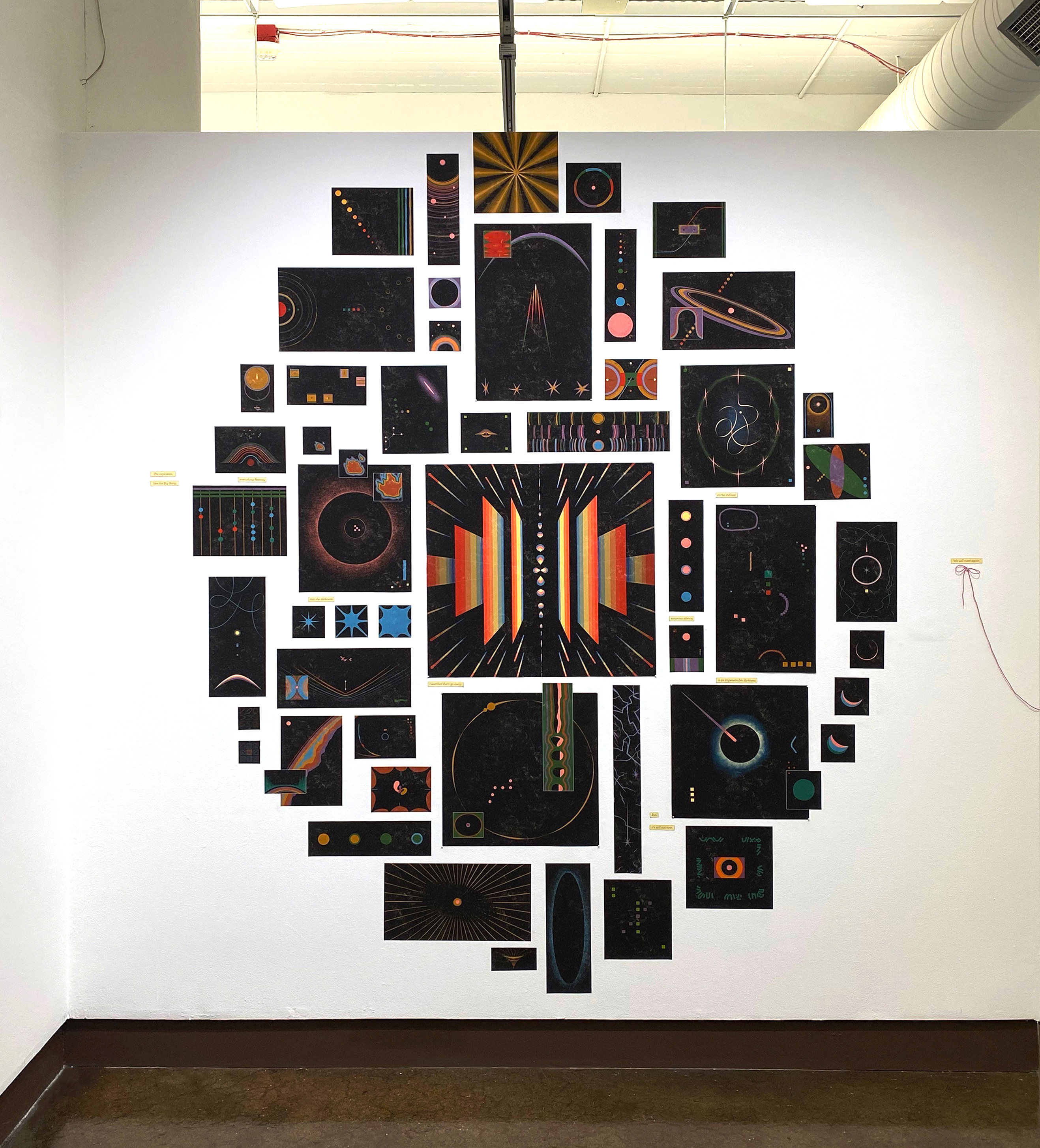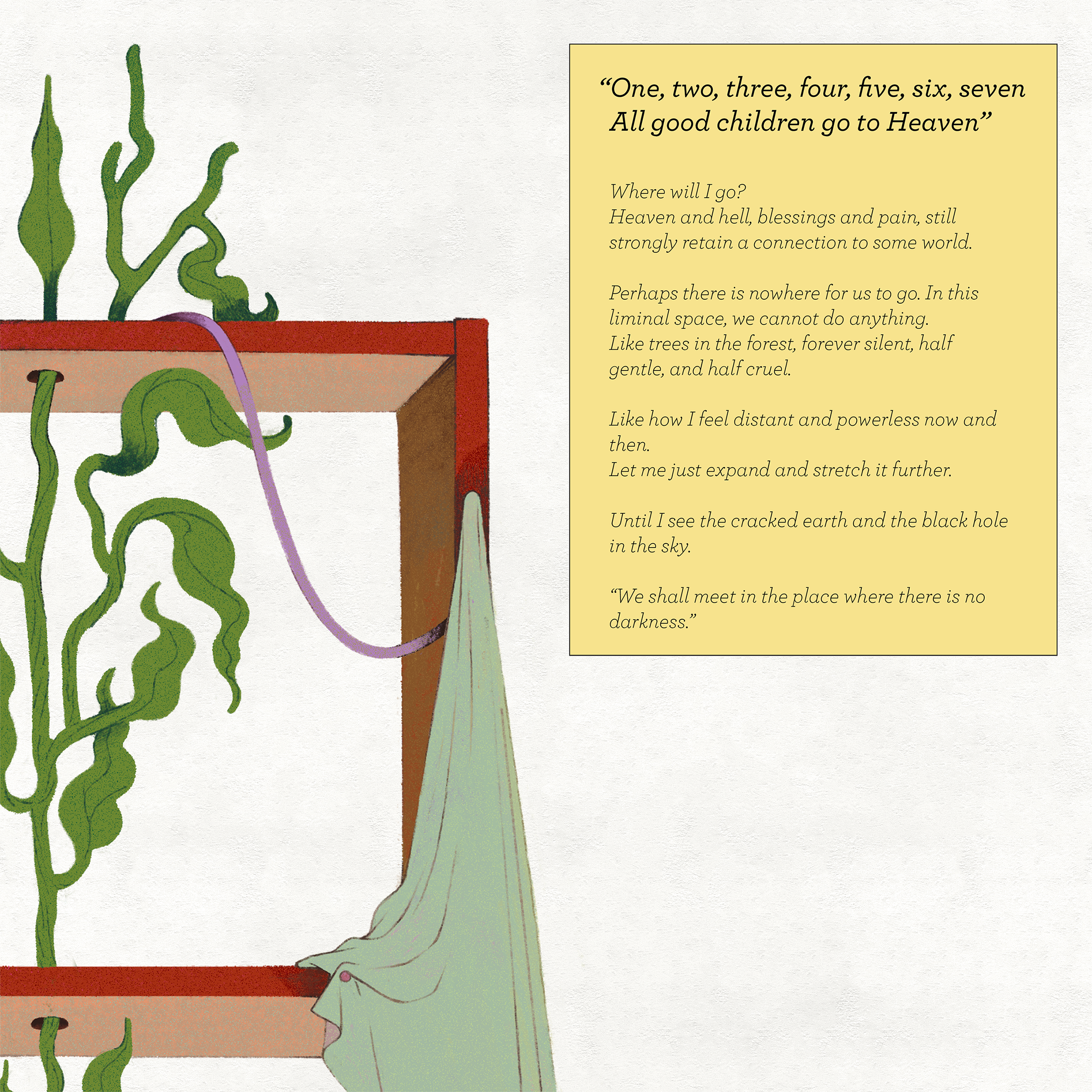 My thesis project “One, two, three, four, five, six, seven; All good children go to Heaven” is an experimental narrative work of abstract comics across 3 walls, focusing on the travel in the liminal space between life and death.Curation
